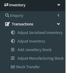 1. Go to the back-office and click on the option Inventory - Transactions and then click on the option Adjust Jewellery Stock.