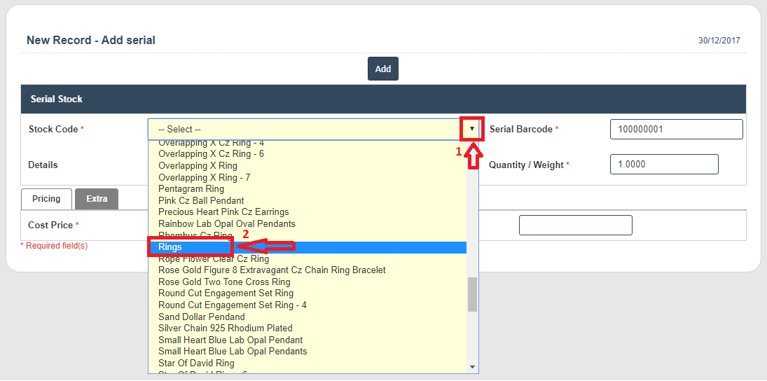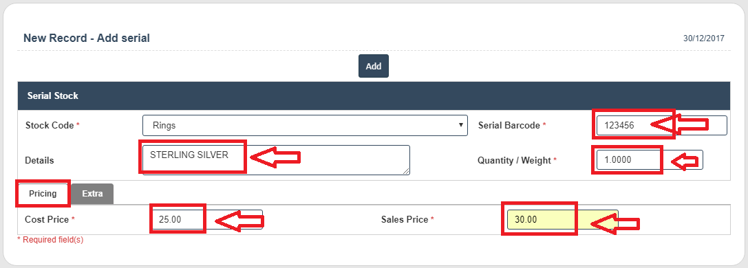 Step3: - then add Serial Barcode, Details, Quantity then in Pricing tab add Cost Price, Sales Price.