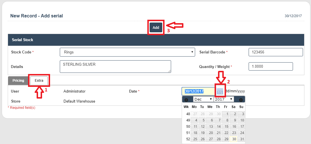 Step4: - Select Extra Tab in that add date of stock received. Then click on add button.