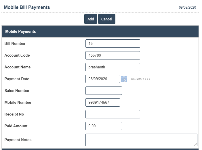7. Once you have completed the Bill Payment details, click the Add button as shown below.