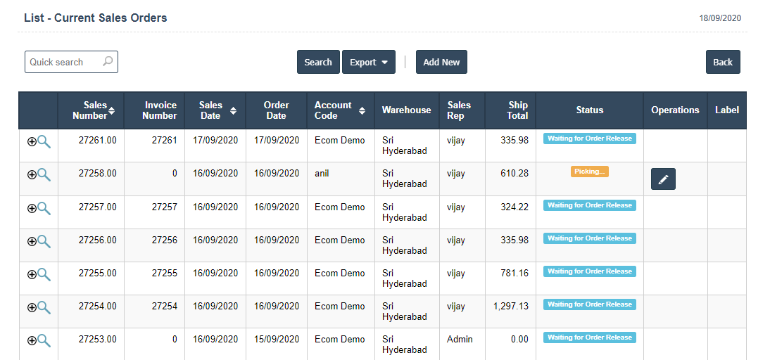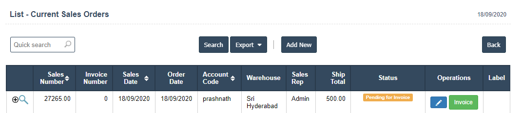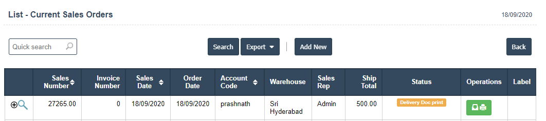 2. Add New : This Button is used for Adding New Current Sales Order.