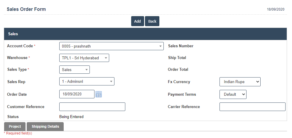 6. Once you have completed the Current Sales Order details, click the Add button as shown below.