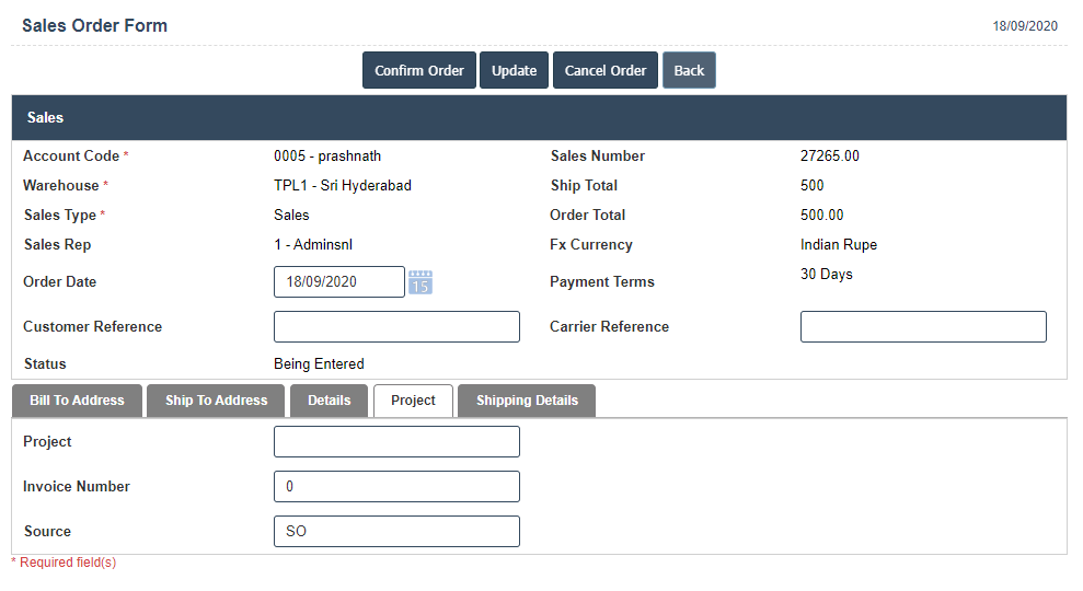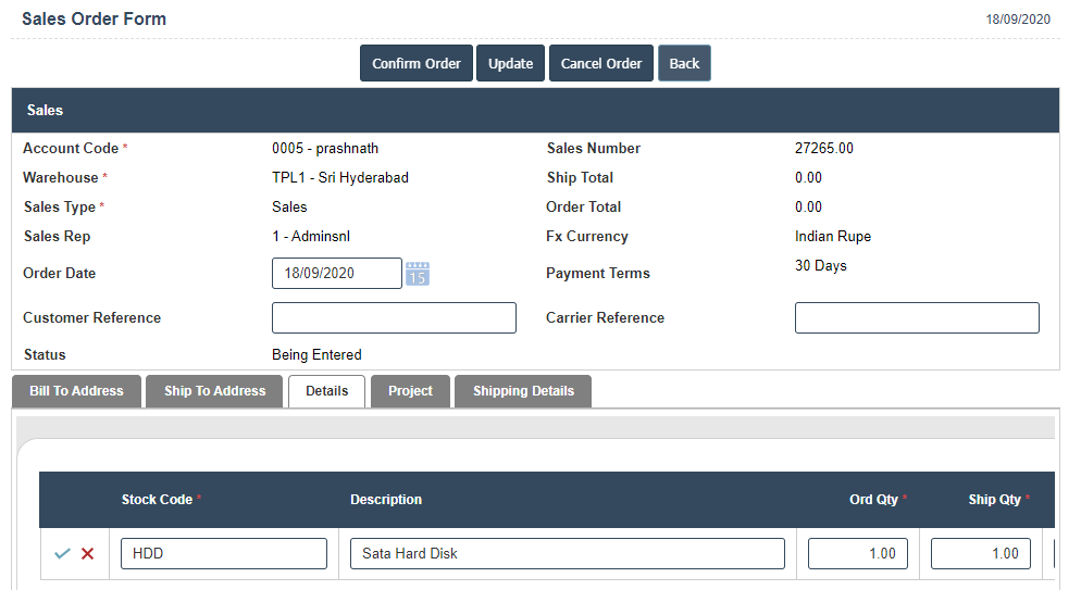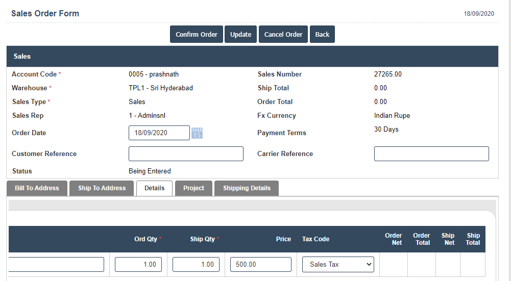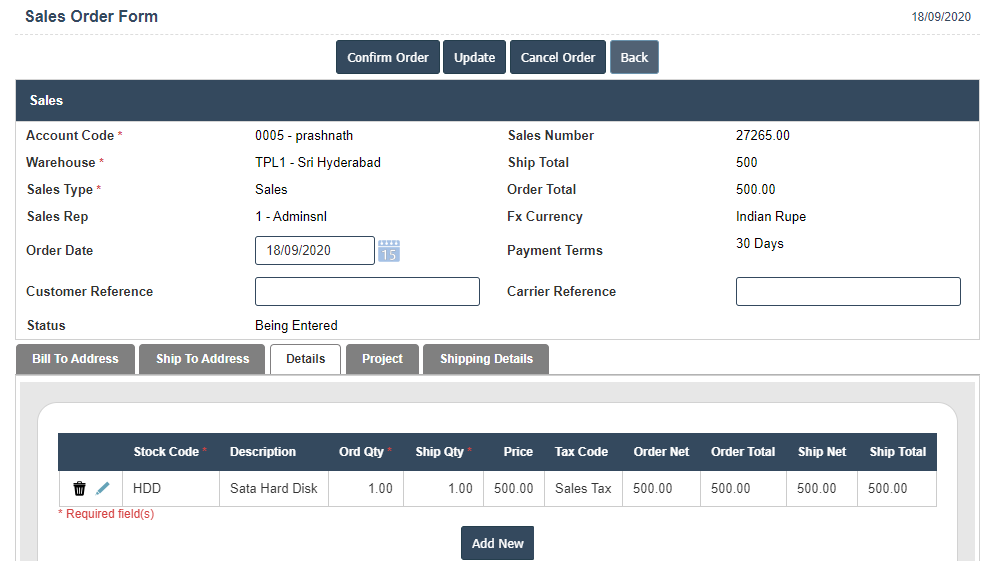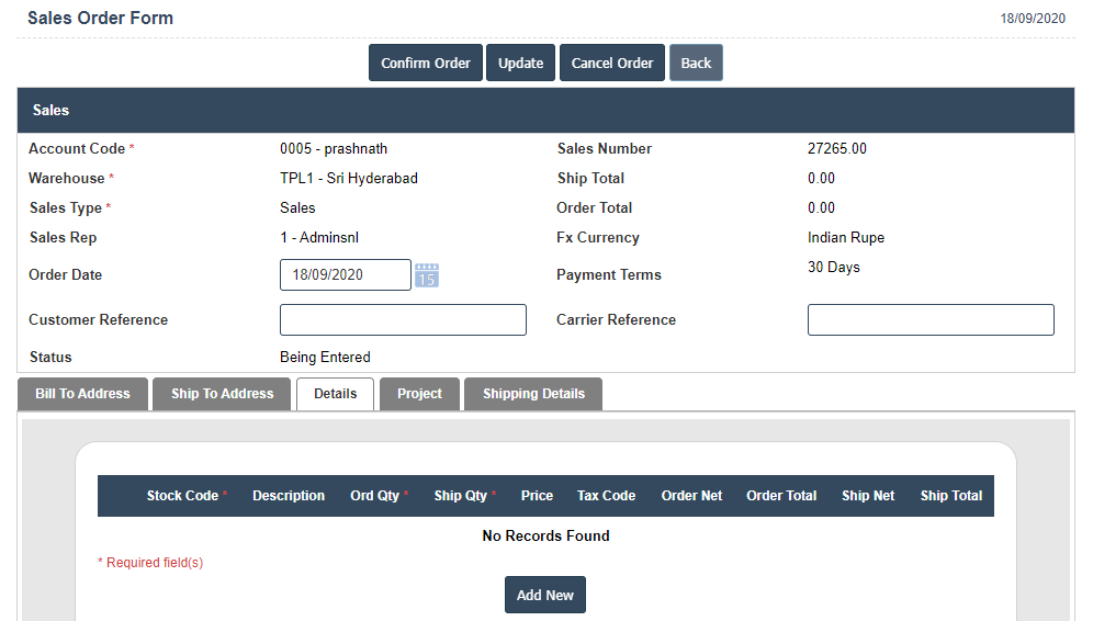 4. A New Current Sales Order will open the new page and fill the details.