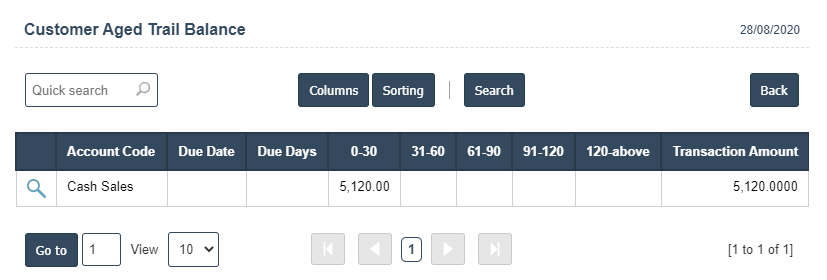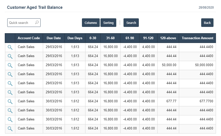 Customer Aged Trial Balance is a report list accounts receivable with outstanding balance by age buckets (30\60\90\120\above days etc.). This report provide different options like printing report in detailed form, listing all outstanding documents for each customer, or summary form, printing one line for each customer number, including the current balance and the balance in each aging period.