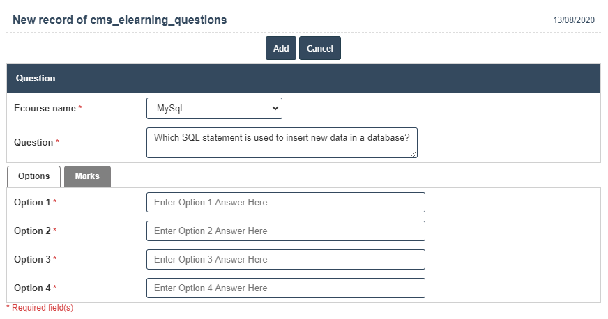 5. Once you have completed the E-learning Questions details, clicking the Add button as shown below.