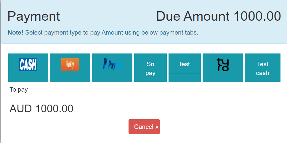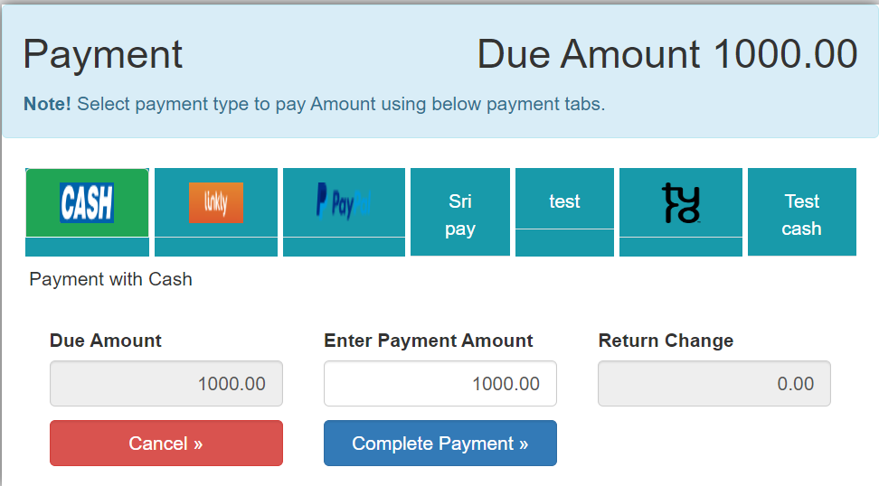 5. In above image shows so many options to select payment type i.e Card , Cash, Check, cheque, Cash Payment, Paypal, Sri pay and Tyro.