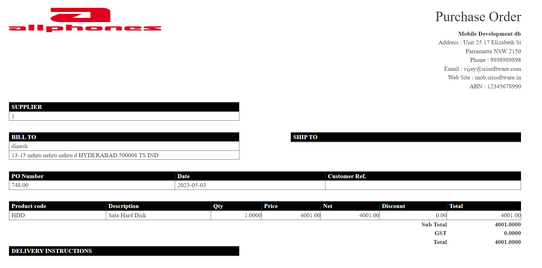 12. In the Above image Click on "Print Symbol" Then it will displays Purchase order as shown below.