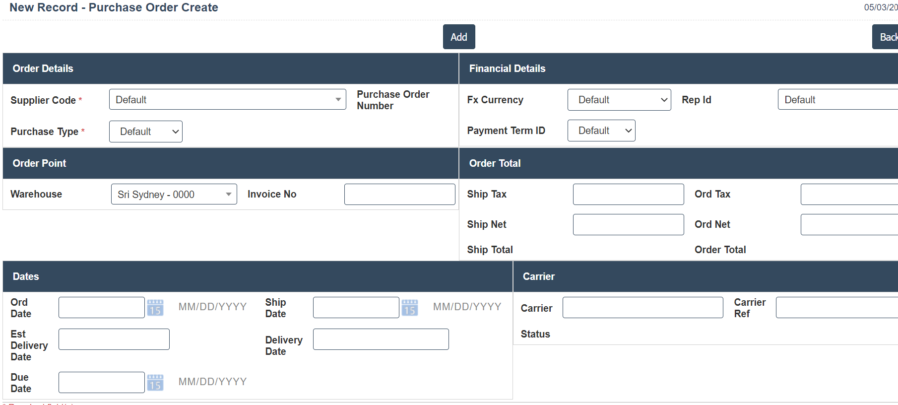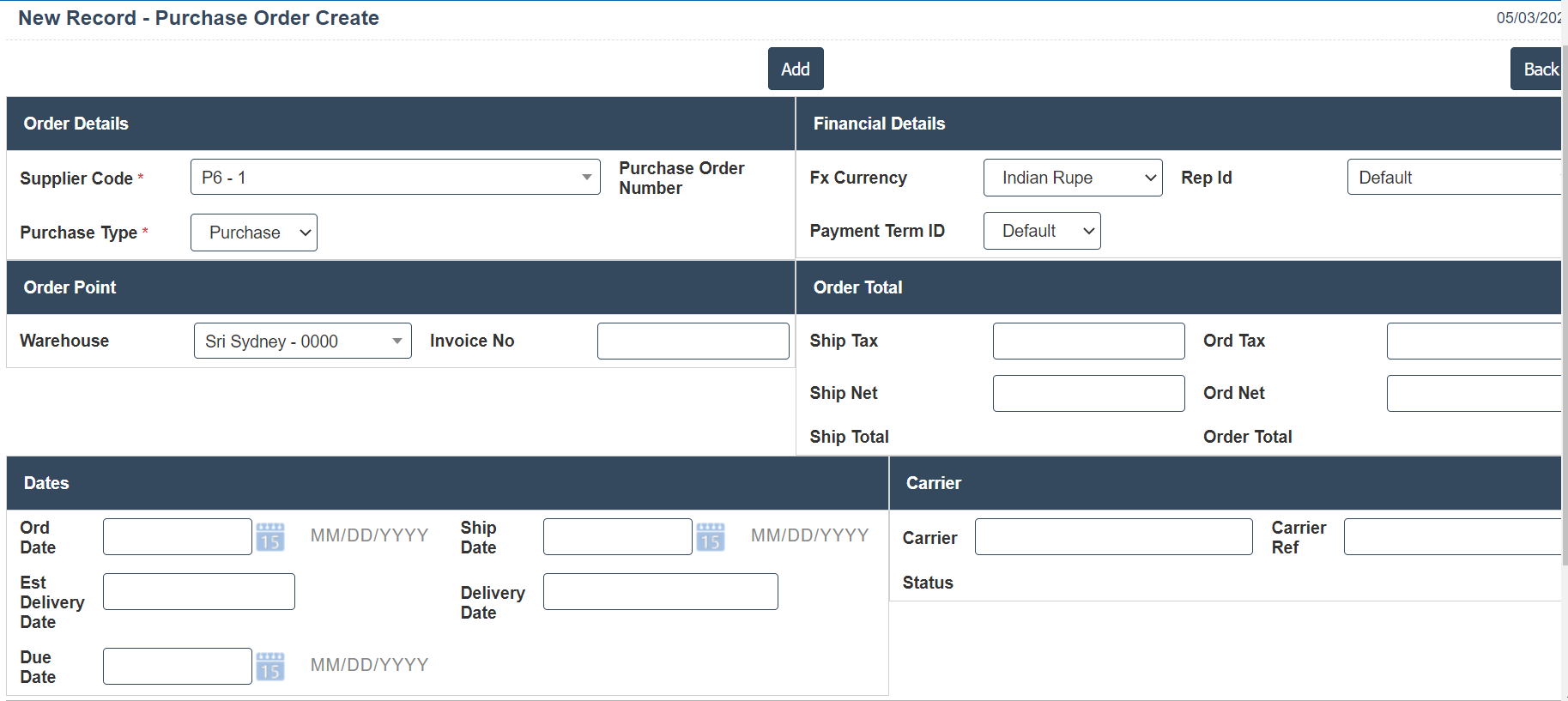 6. Once you have completed the Purchase Order Create details, click the Add button as shown below.