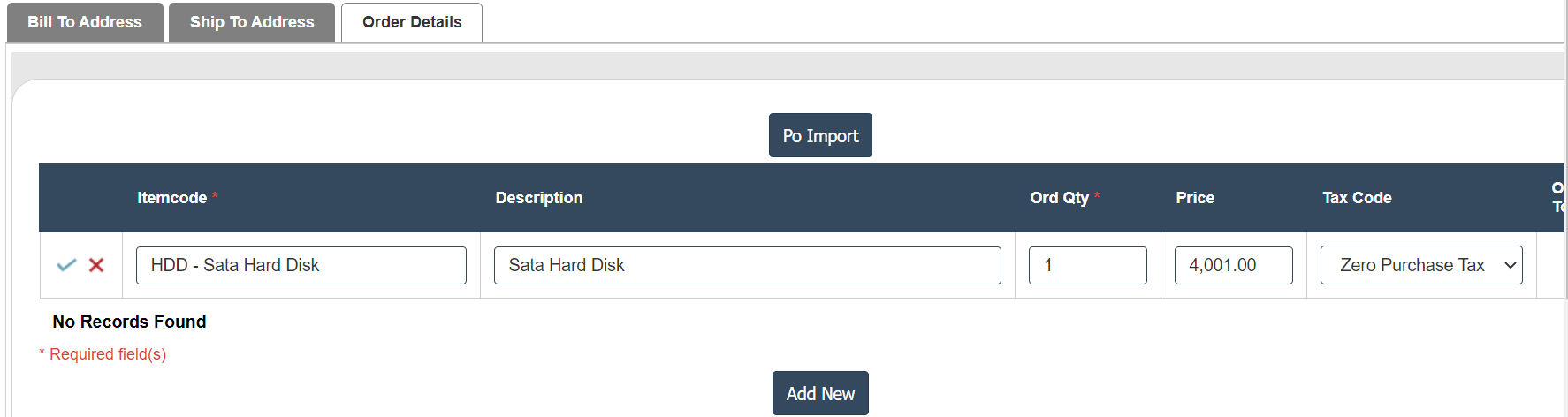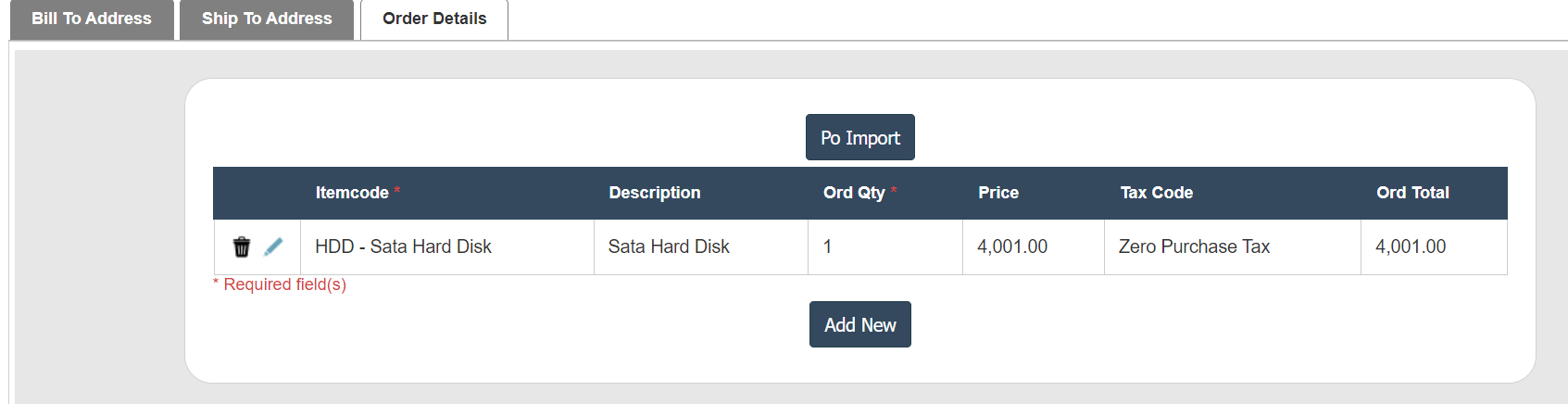 9. Click on Order Details button then click on Add New button it will displays following image.