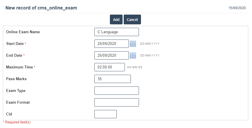 6. Once you have completed the Online Exam details, click the Add button as shown below.
