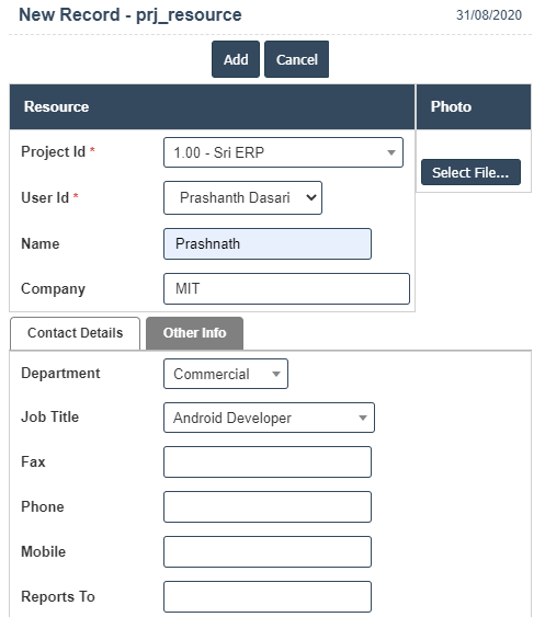 6. Once you have completed the Project Resource, clicking the Add button as shown below.