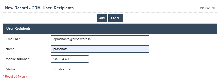 7. Once you have completed the Recipients details, clicking the Add button as shown below.