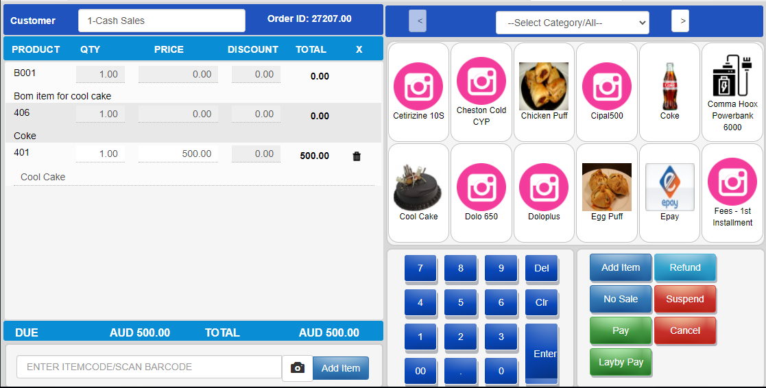 3. In below image ITEMCODE is Cool Cake and ITEM is PAY and Price is 500 then click on Pay Button then it will displays the following image.