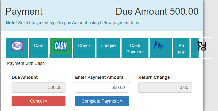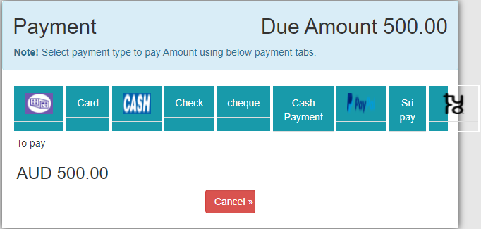 4.In below image shows so many options to select payment type i.e Card , Cash, Check, cheque, Cash Payment, Paypal, Sri pay and Tyro.