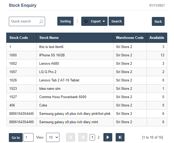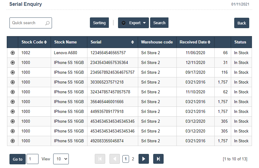 - Serial Enquiry : The serial enquiry screen shows the imei's currently in stock in the current store along with the Age of the imei and the cost value. Ensure that you always sell out.
