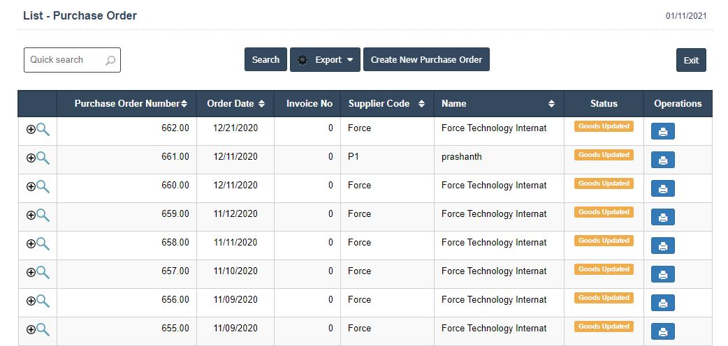 - List of Purchase Order : A purchase order (PO) is that's issued by a vendor to pay a supplier for the sale of a list of specific products or services that will be delivered in the future. Typically, a PO includes the types, quantities and prices of the products or services being purchased by the vendor.