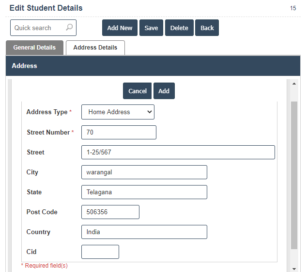 6. Once you have completed the Student details, click the Add button as shown below.