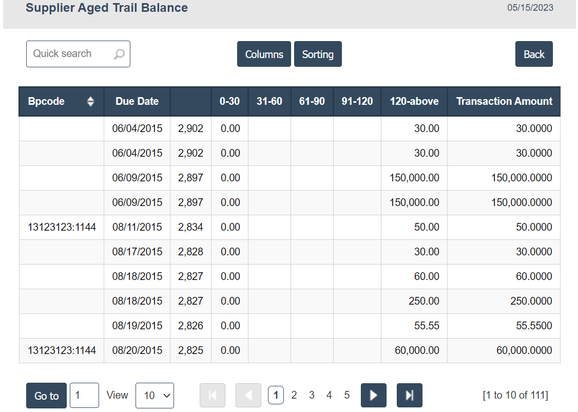 Supplier Aged Trial Balance is a report list accounts Payable with outstanding balance by age buckets (30\60\90\120\above days etc.). This report provide different options like printing report in detailed form, listing all outstanding documents for each customer, or summary form, printing one line for each customer number, including the current balance and the balance in each aging period.