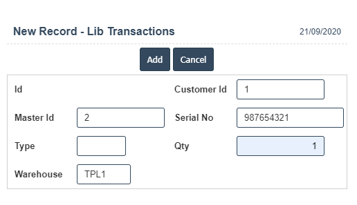 8. Once you have completed the Lib Transactions details, click the Add button as shown below.