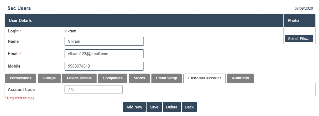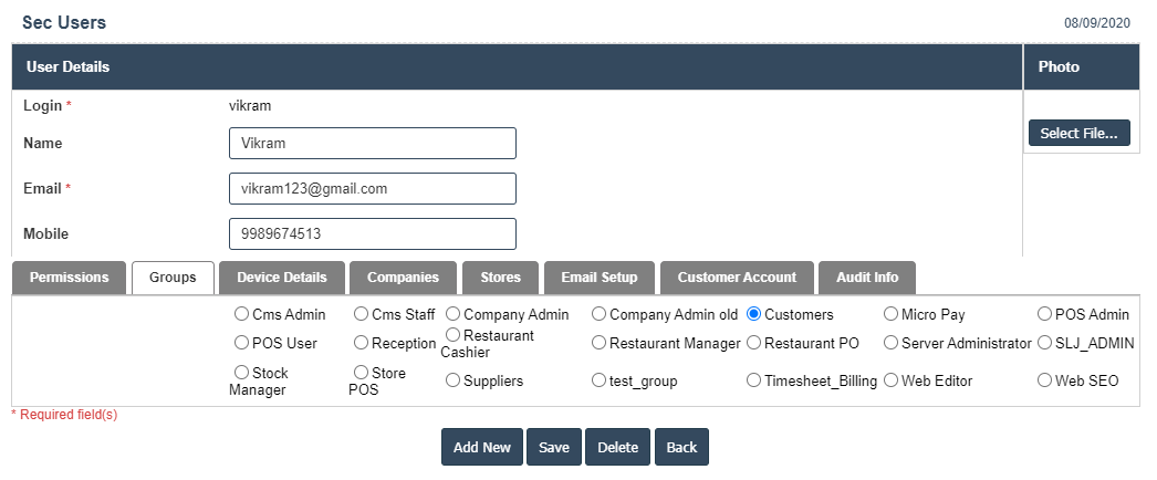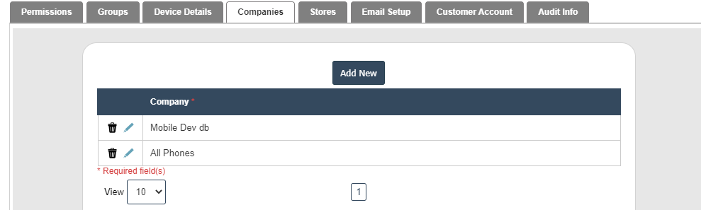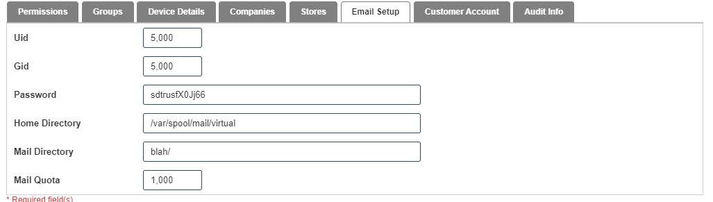 Permissions Device details,Groups,Companies,Stores, Email Setup, Customer Account and Audit info.